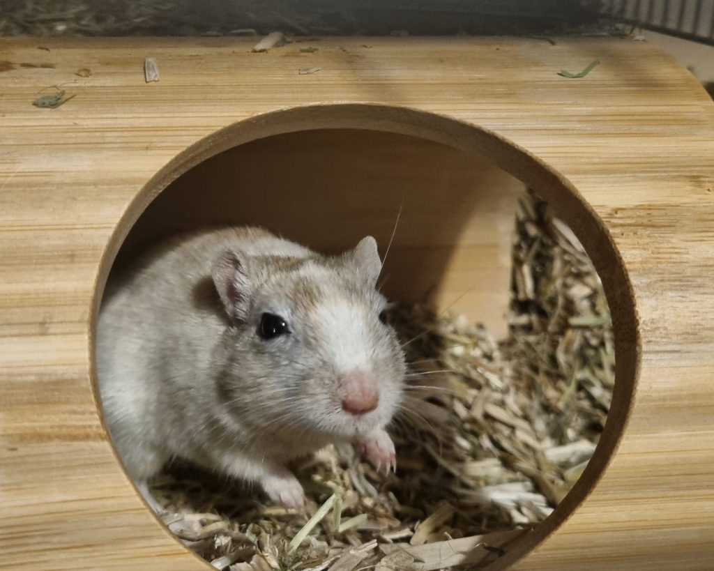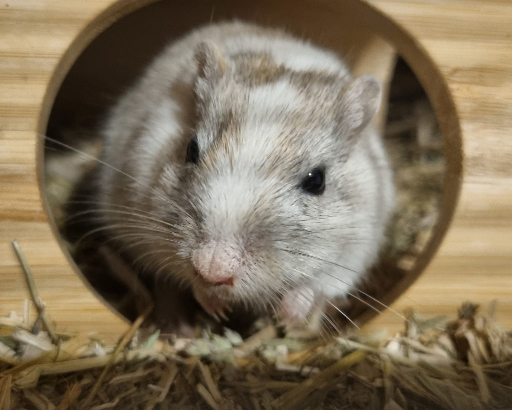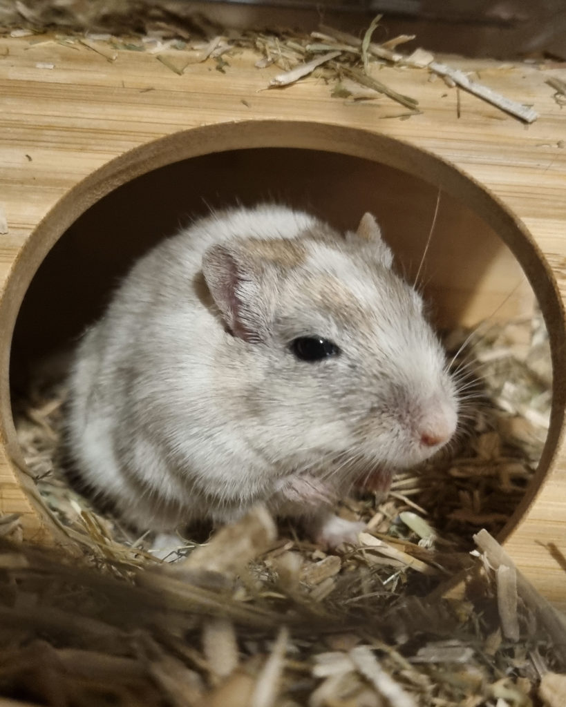 Je suis une grande exploratrice : j’adore creuser, réorganiser mon nid et inspecter tout ce qui se passe autour de moi. Si vous me confiez un habitat spacieux avec beaucoup de substrat, du carton et du bois à ronger, je saurai parfaitement m’occuper et vous montrer mes talents d’architecte souterraine !