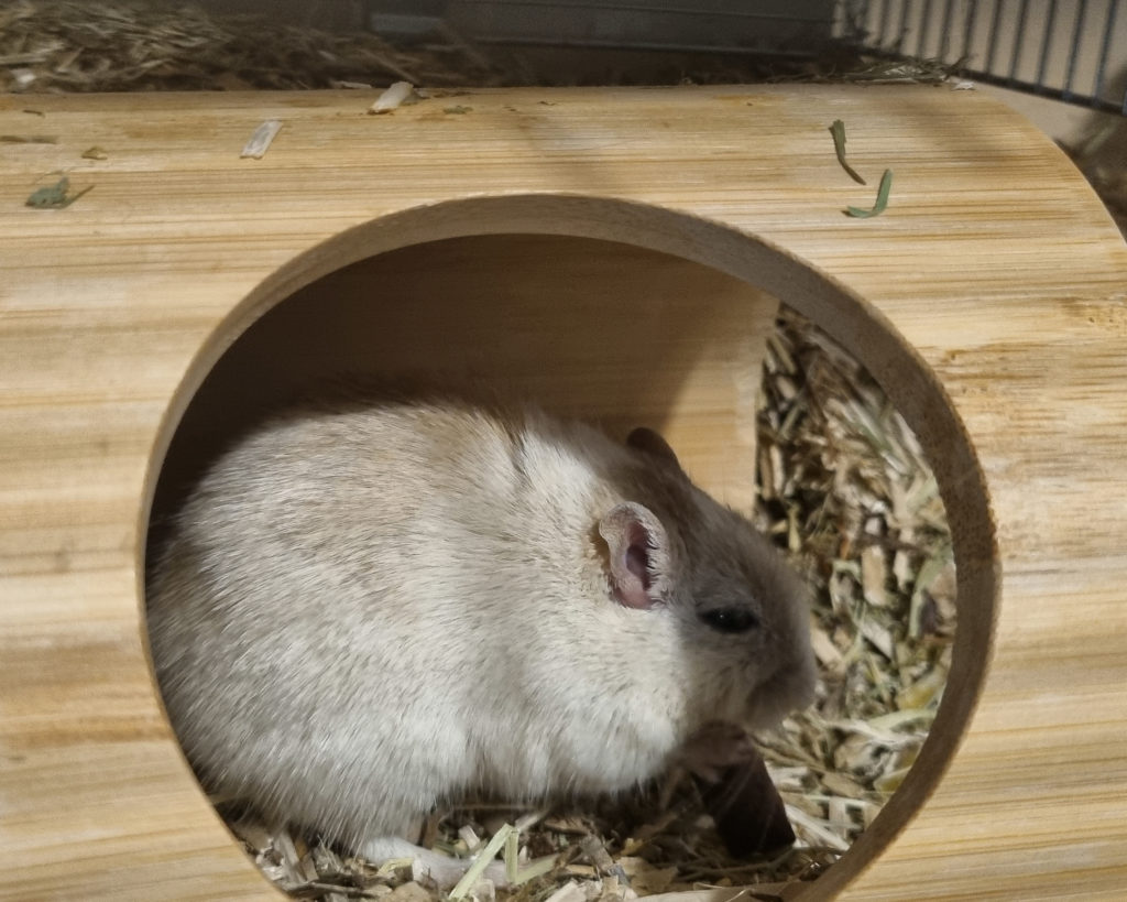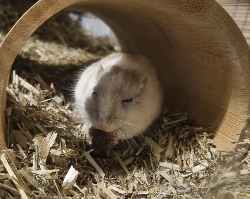 Comme je vis sans congénère, j’ai besoin d’un environnement riche et stimulant pour rester curieuse et active : creuser, chercher mes graines, transformer mon nid… c’est mon quotidien préféré.