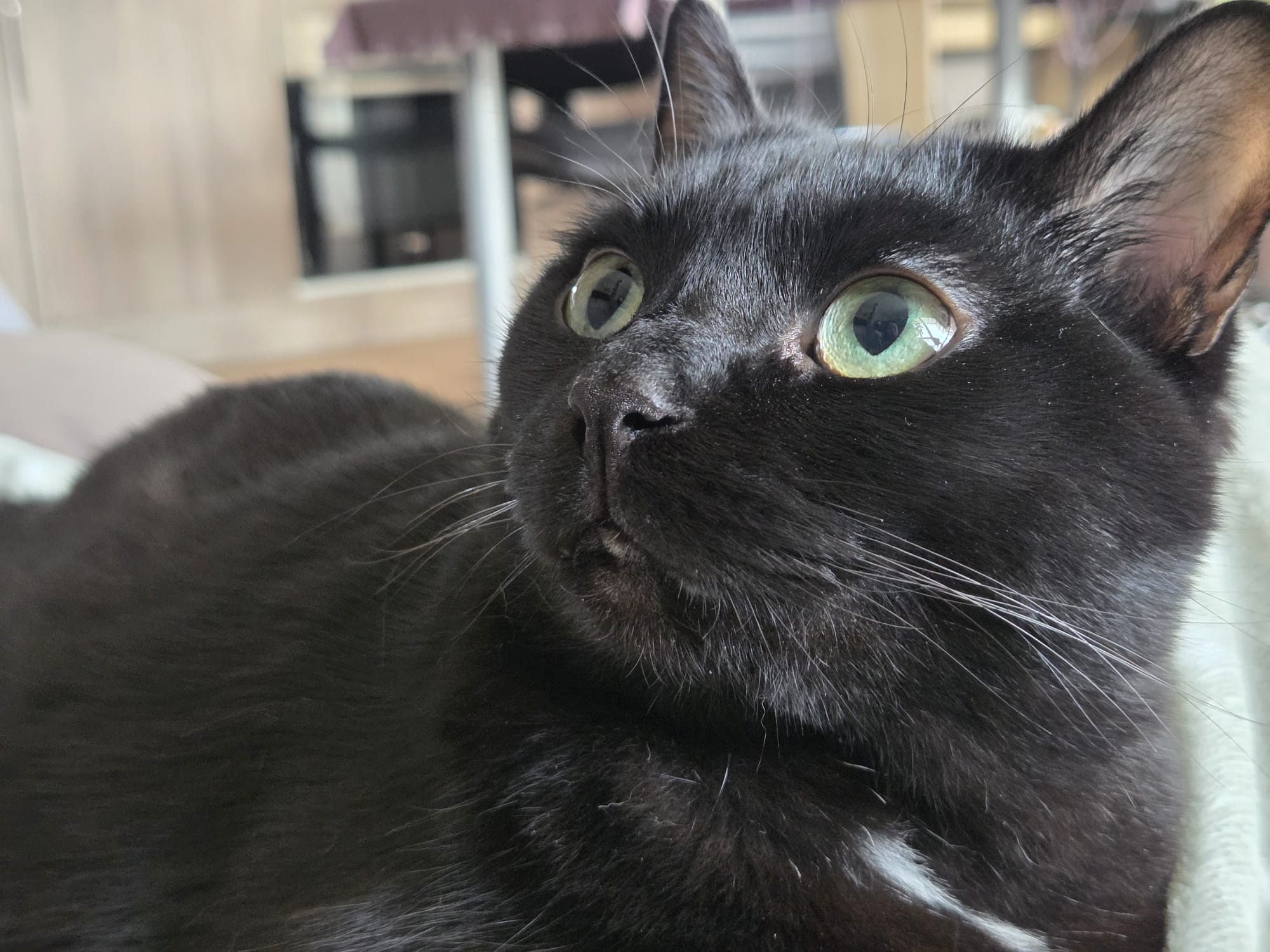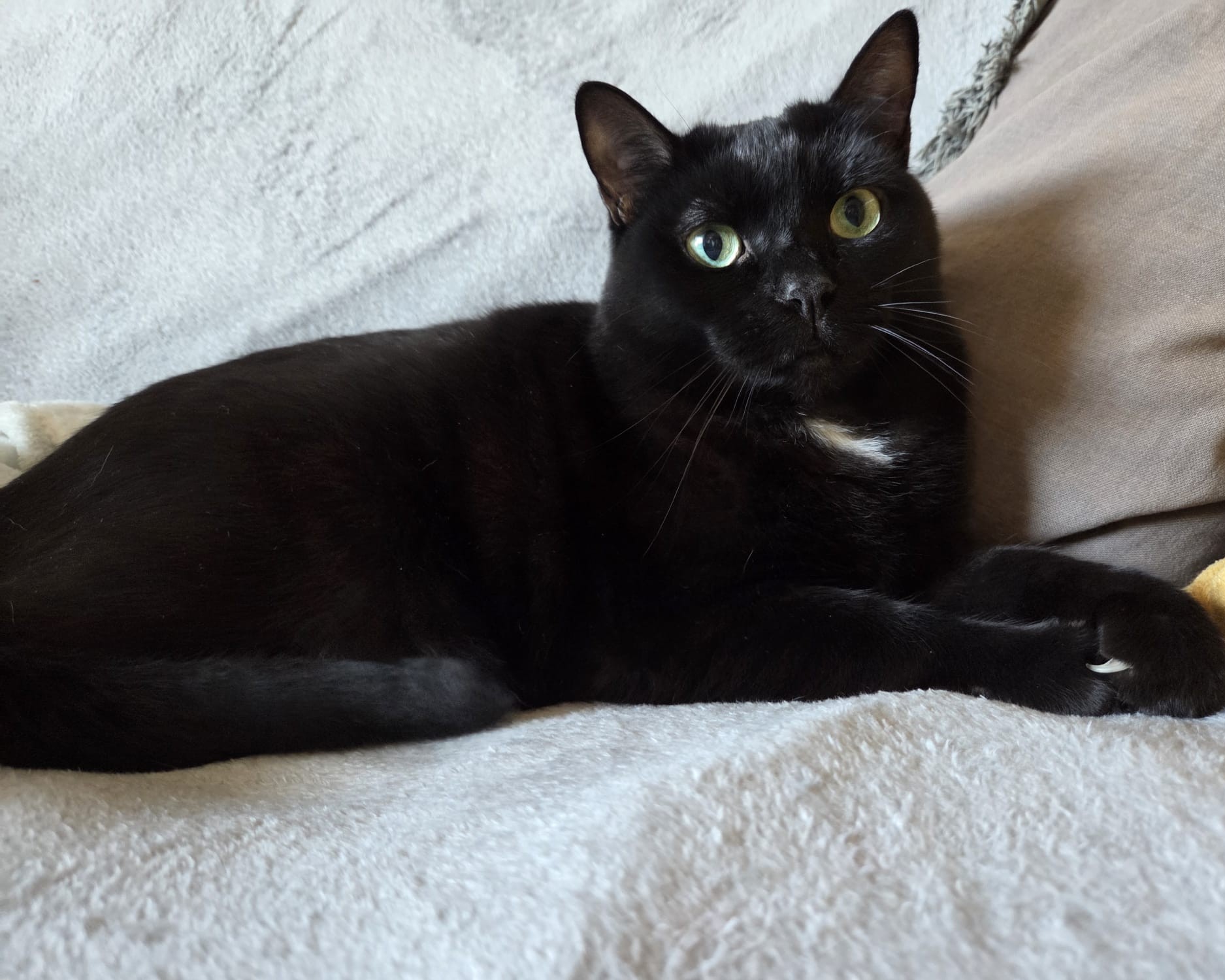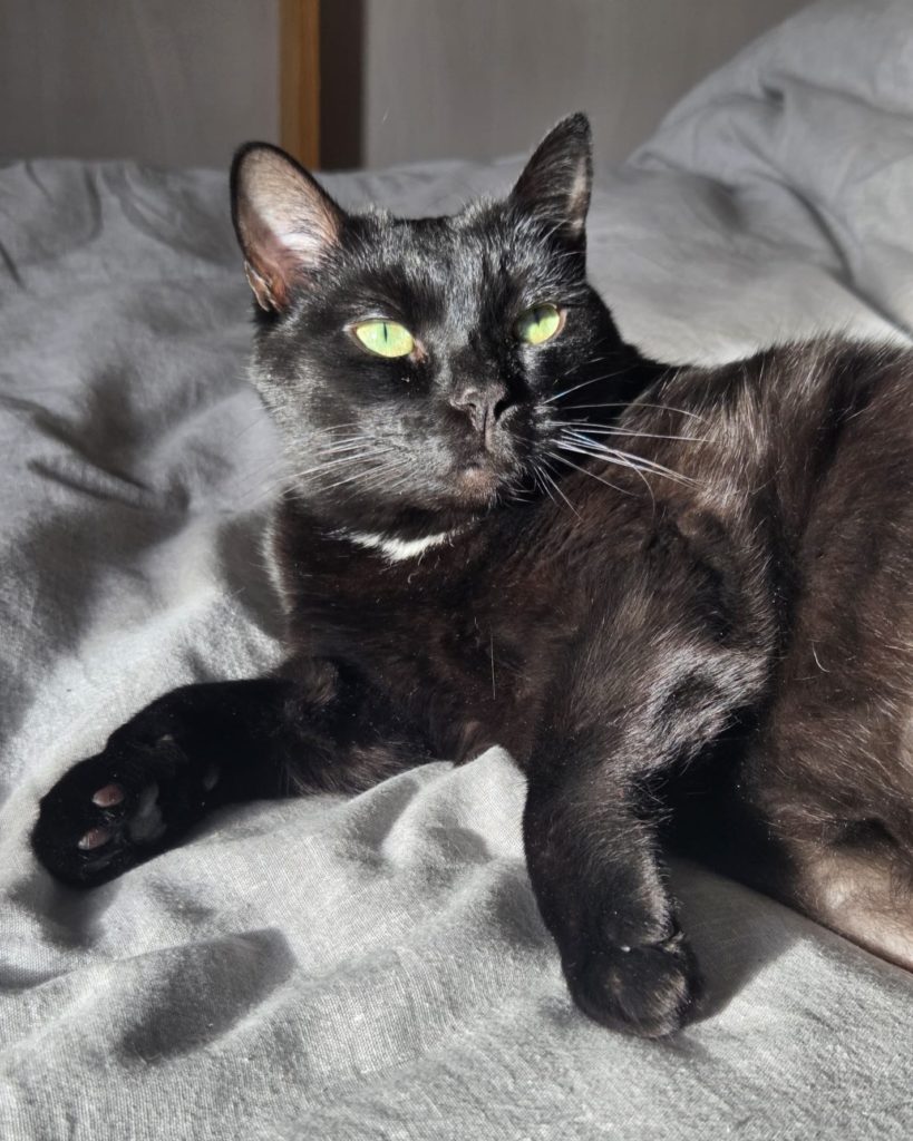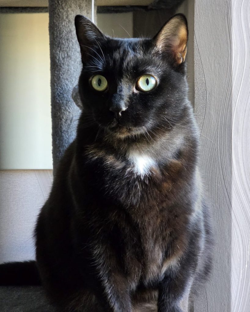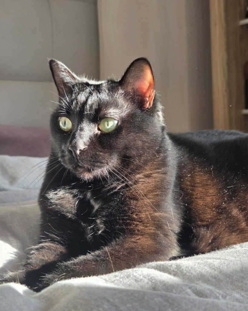 Côté physique, je suis une élégante chatte noire 🖤 avec une jolie petite tâche claire qui me rend unique ✨ Et impossible de résister à mes grands yeux verts 💚… ils font fondre tous ceux qui croisent mon regard 😽