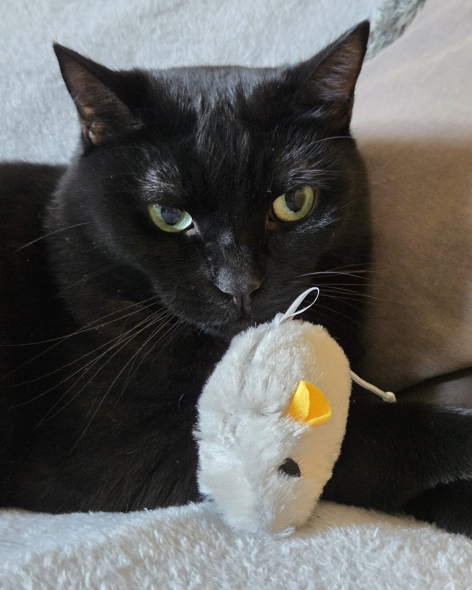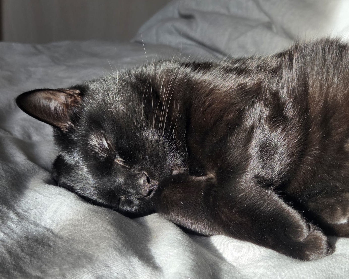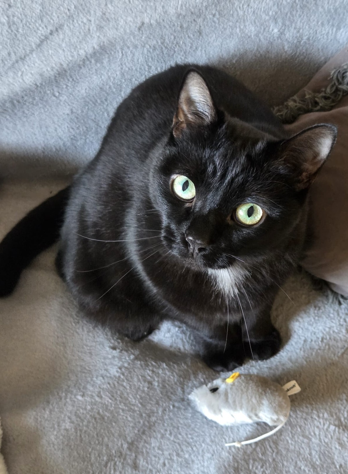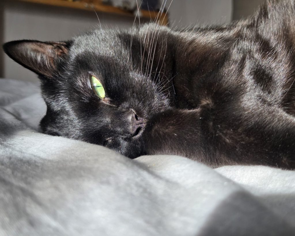 Côté physique, je suis une élégante chatte noire 🖤 avec une jolie petite tâche claire qui me rend unique ✨ Et impossible de résister à mes grands yeux verts 💚… ils font fondre tous ceux qui croisent mon regard 😽