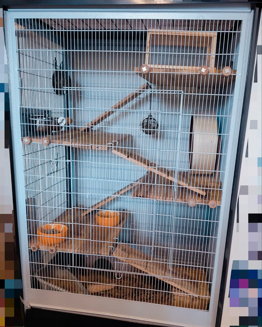 )On peut aussi partir avec notre grande cage et tous nos accessoires, histoire de ne pas être trop perdus dans notre nouveau chez-nous.