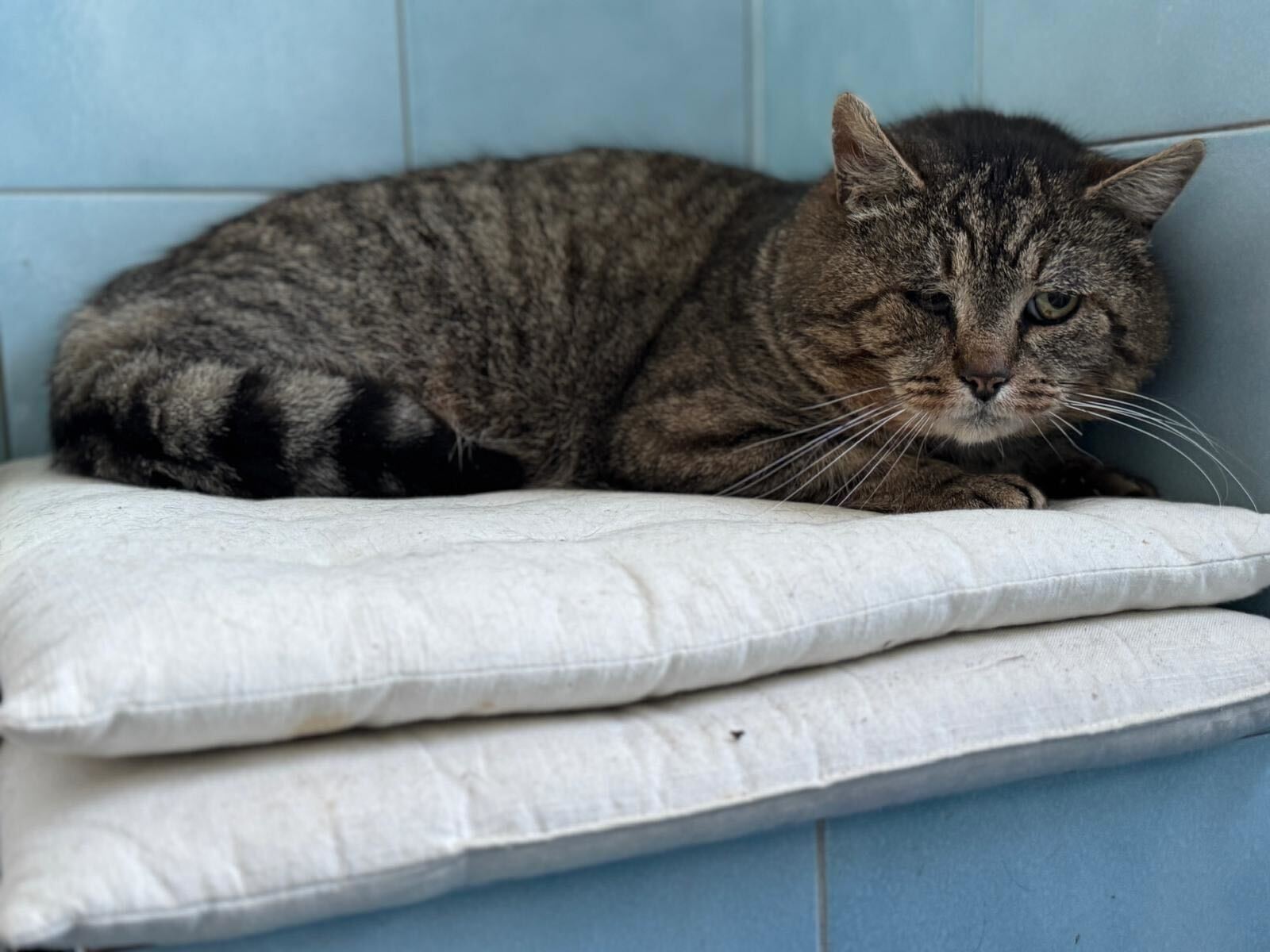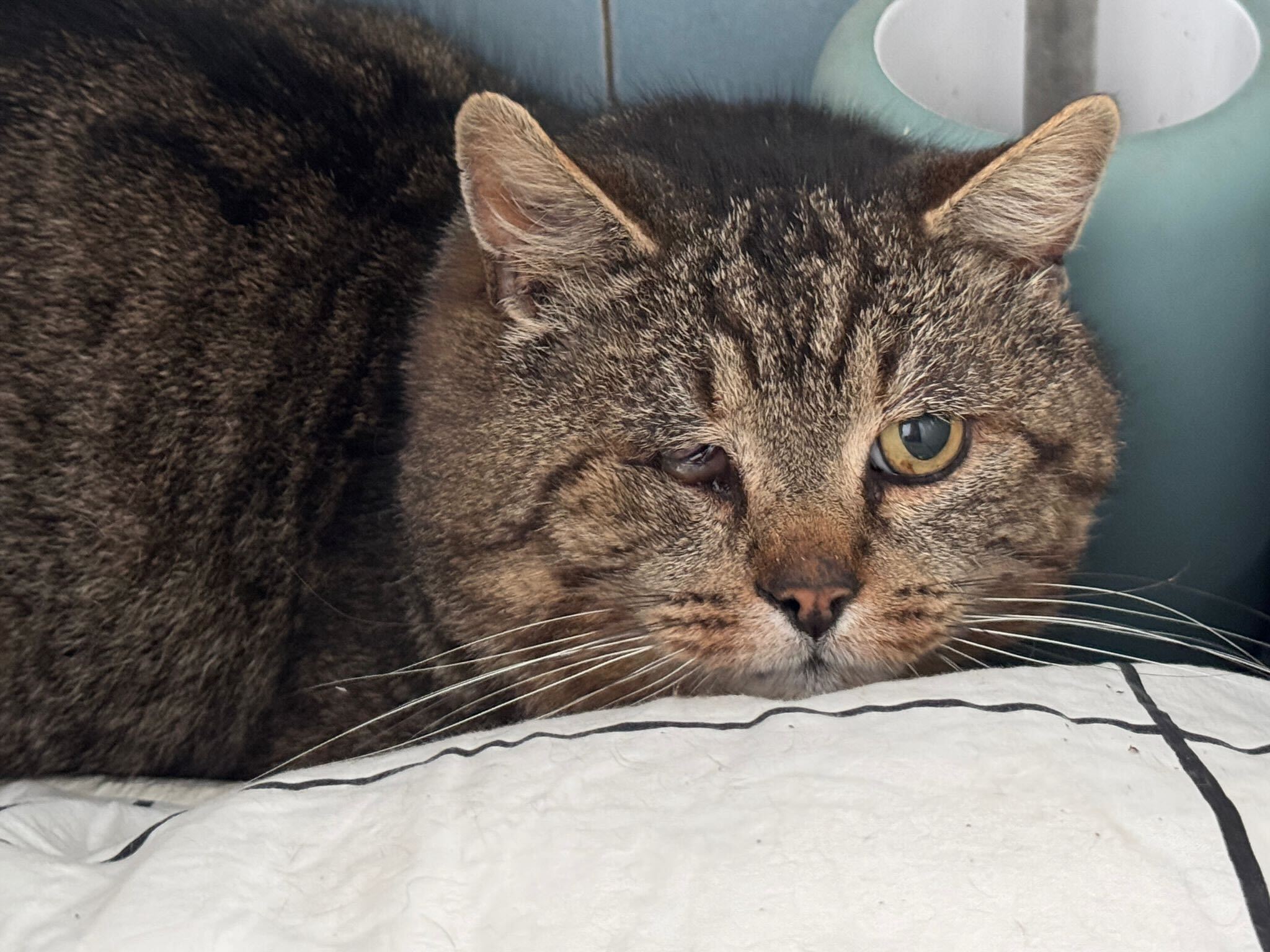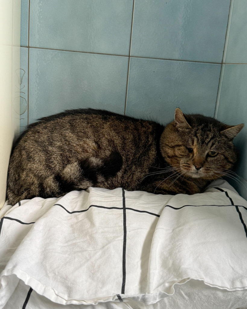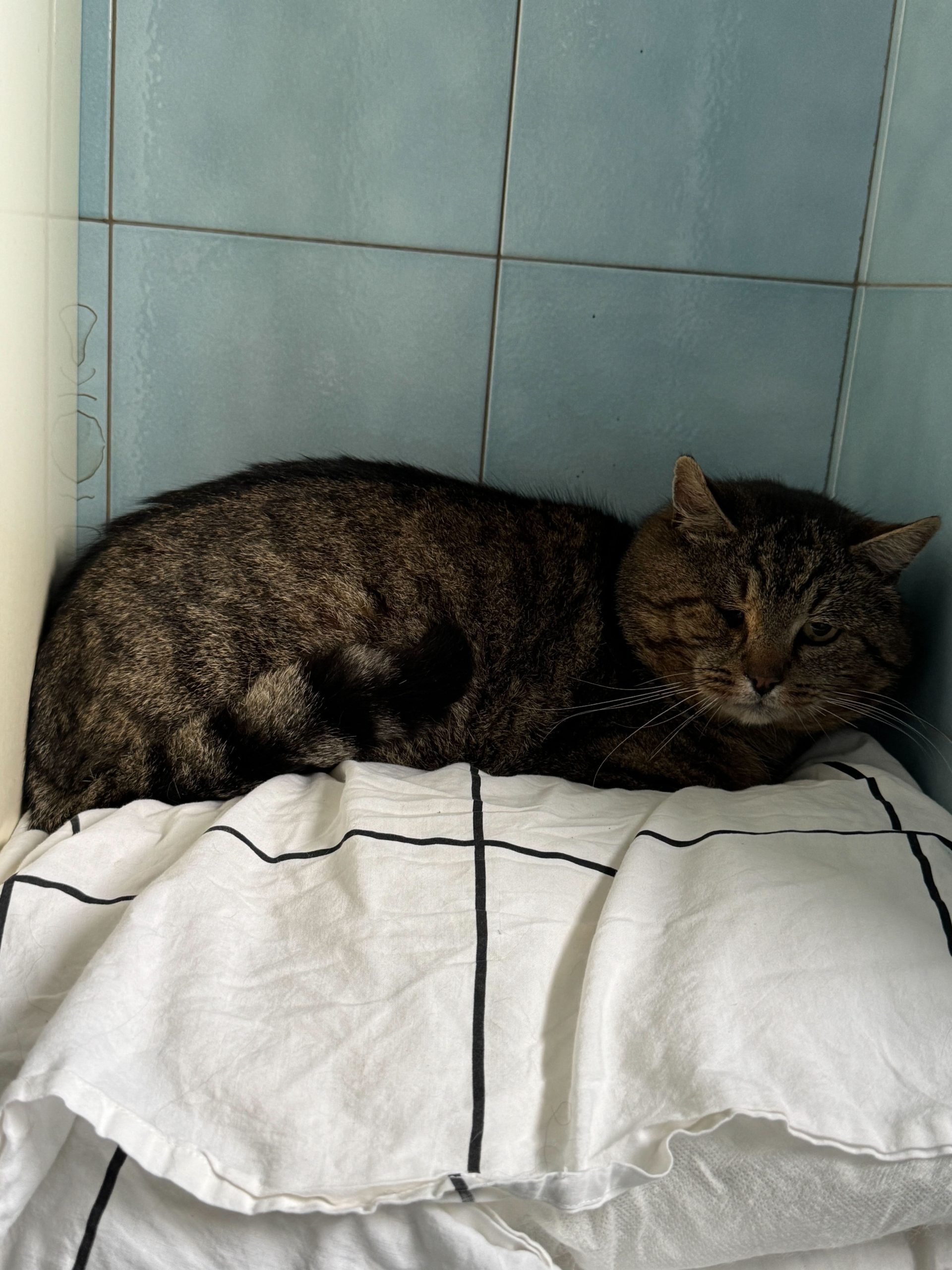 J’ai été trappé, stérilisé, identifié et on a stabilisé mon œil abimé et suis maintenant en sécurité dans la salle de bain d’une famille d’accueil provisoire.